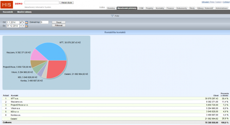 Manažerský informační systém (MIS) představuje komplexní a efektivní řešení pro sledování všech firemních procesů. Na jednom místě sjednocuje všechna relevantní data z různých oblastí. Pomocí těchto dat je posléze možné odhalovat skryté souvislosti, sledovat trendy v dílčích oblastech z různých úhlů pohledu a formulovat tak analýzy dat v závislosti na nejrůznějších kritériích (čas, druh činnosti, dílčí projekty, zákazníci, zaměstnanci atd.).